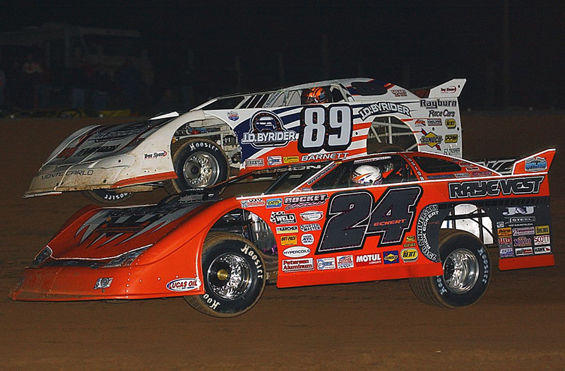 Rick races Steve Barnett for the heat race lead at the Brownstown (IN) Speedway on April 1, 2006 -